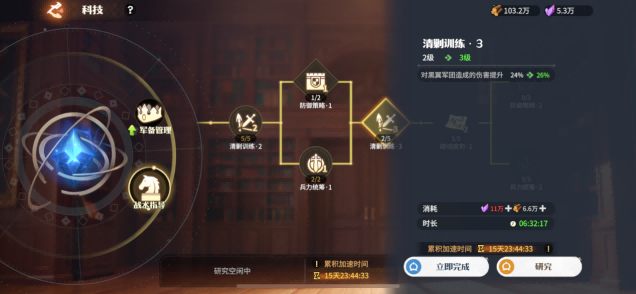 而在前期發(fā)育過程中,大家可能遇到打不過黑潮,任務(wù)卡關(guān)的情況。這里的解決辦法就是在【戰(zhàn)爭學(xué)院】的“研究”中進(jìn)行科技升級,通過增加對黑翼軍團(tuán)的傷害、提升人口上限等方式來有效提升強(qiáng)度,從而解決前期隊(duì)伍強(qiáng)度不足的窘境。